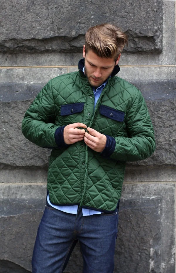 green quilted jacket.