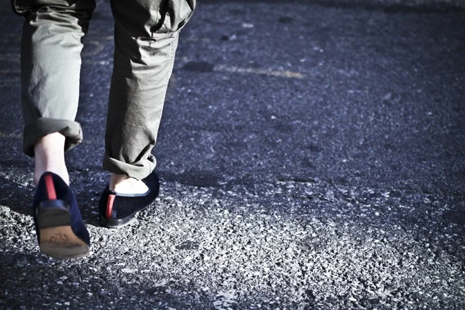 New York City. I walk on her floor, the ‘concrete jungle’. I love the city too much, enough not to disrespect the ‘Big Apple’ by walking on it’s skin with a pair of sandals. Jessica said boots are made for walking, but these velvet slippers were made to kiss the pavement I replied. As my Del Toro’s makes-out with her, she kisses back, she get’s rough, my sole would prove that. I know that she loves me too, because when I kissed her where she was wet, she got the logo tattooed.