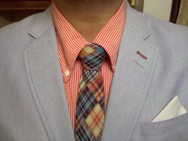 Orange Gant shirt- Psycho Bunny Madras Tie -Black Fleece Blazer-Grandfather’s handkerchief